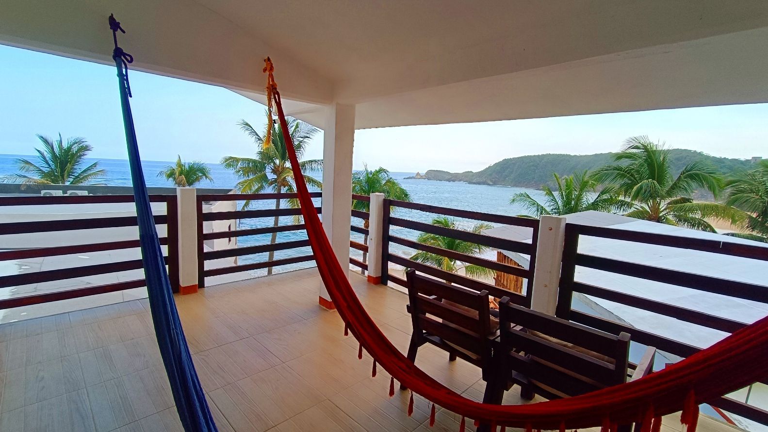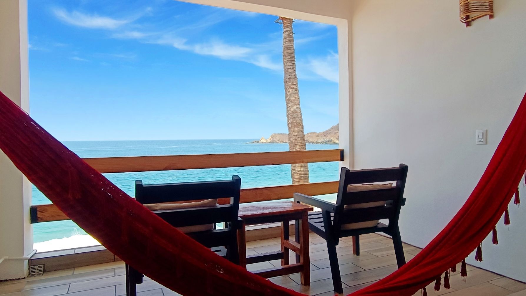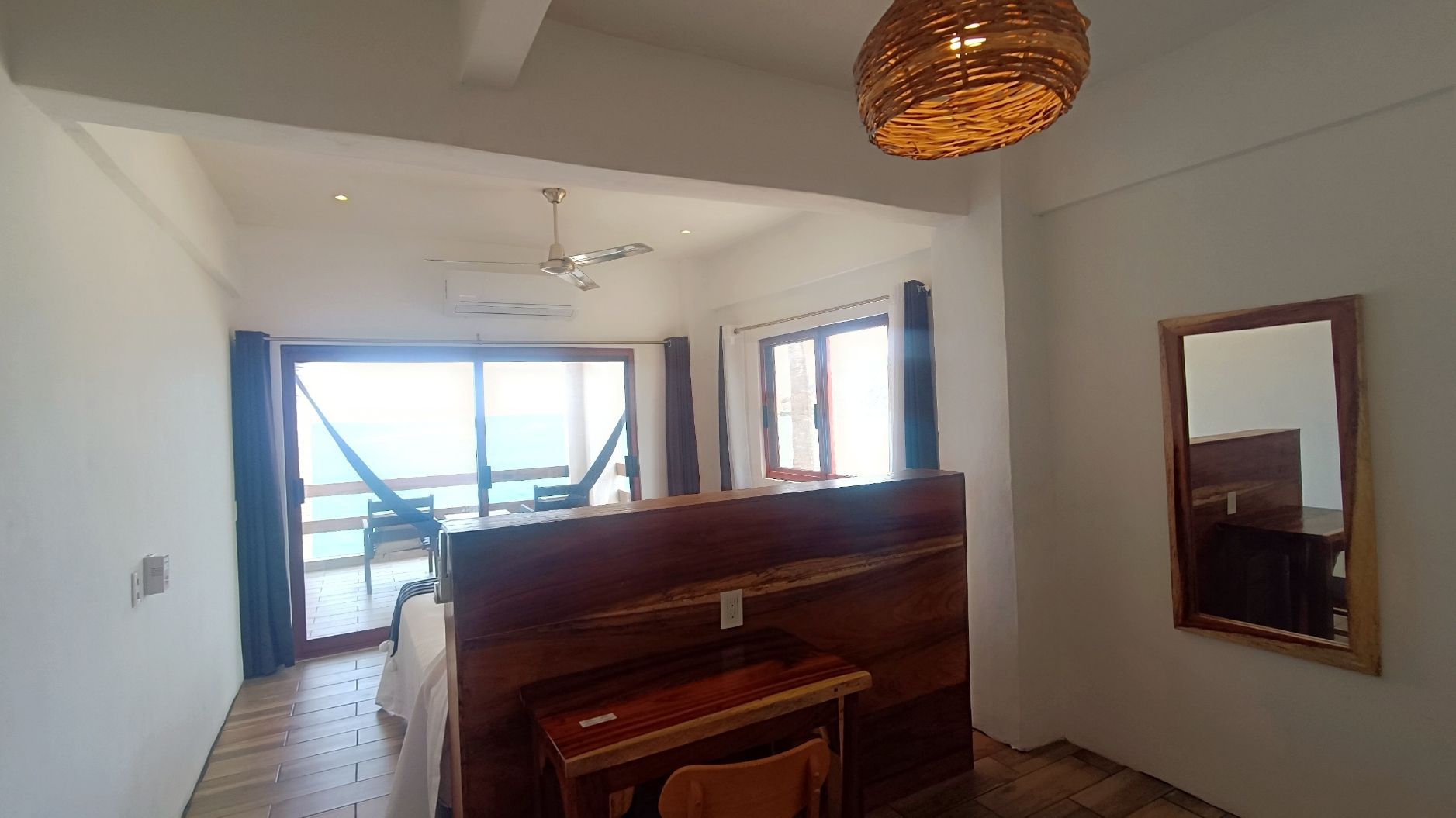 1 cama King size, Aire acondicionado, baño privado con agua caliente, ventiladores, caja de seguridad, wifi, limpieza diaria, toallas, terraza privada con 2 hamacas, vista al mar. NO cuenta con tv ni cocina. Se ubica en el tercer nivel.