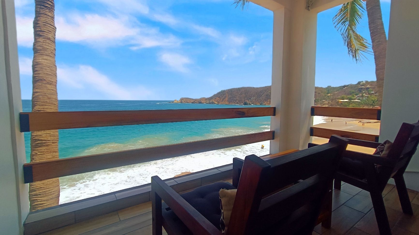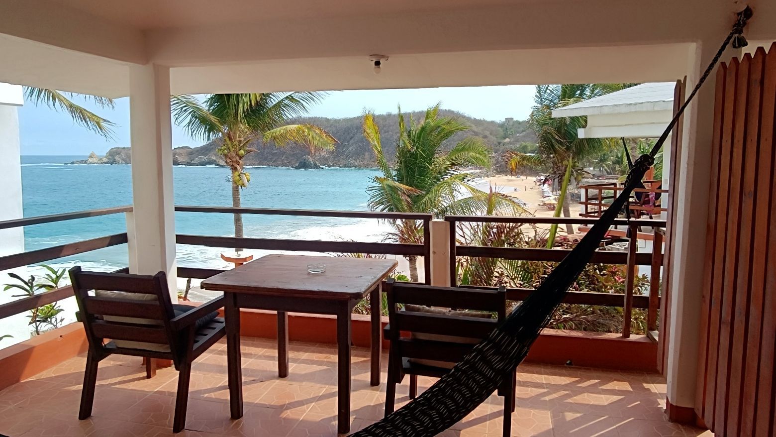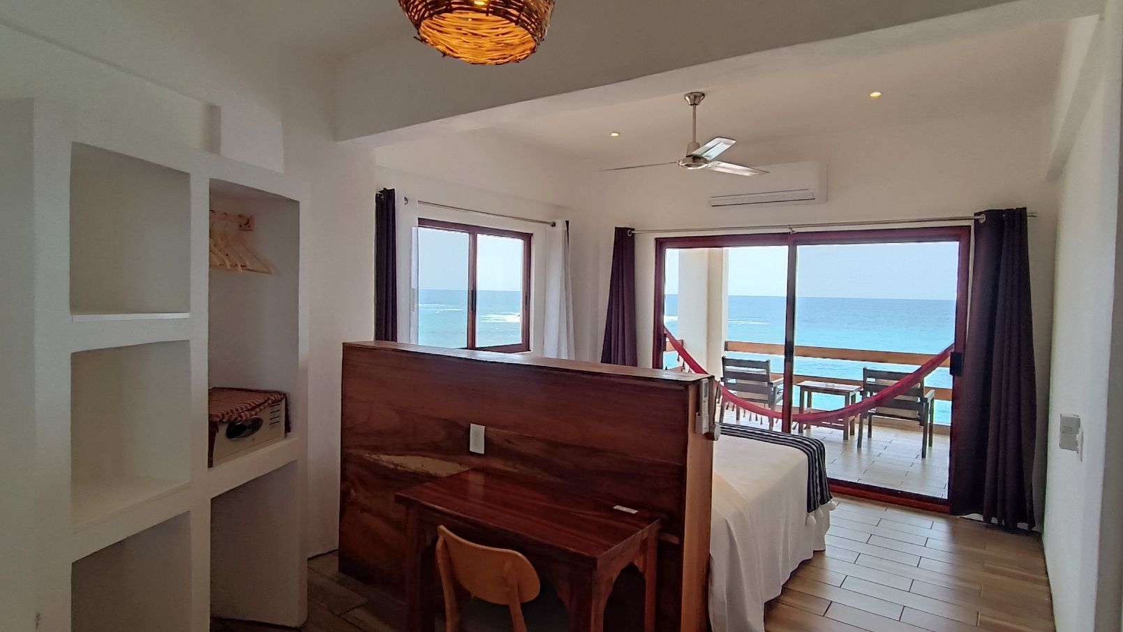 1 cama King size, baño privado con agua caliente, Aire acondicionado, caja de seguridad, wifi, limpieza diaria, toallas (NO de playa), balcòn con vista directa al mar, NO cuenta ni tv, ni cocina. Se ubica en el segundo nivel.
