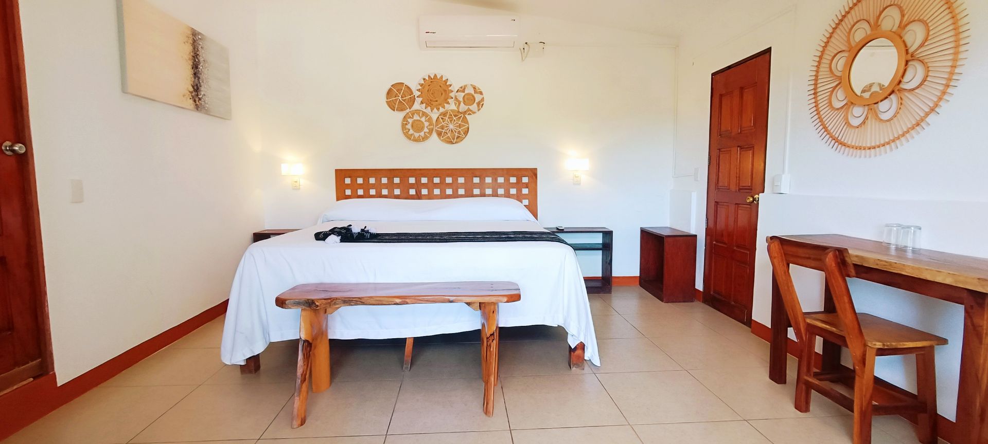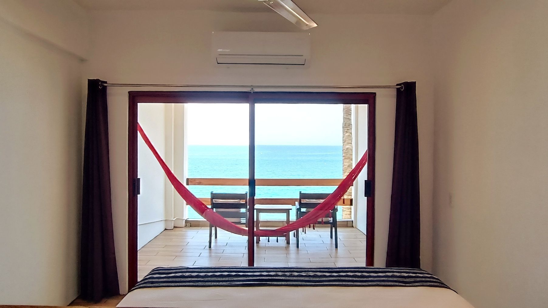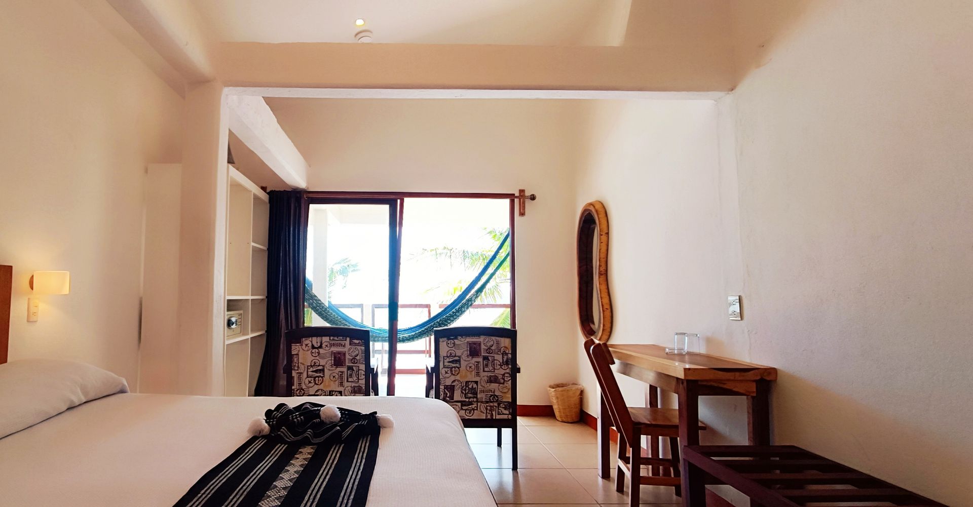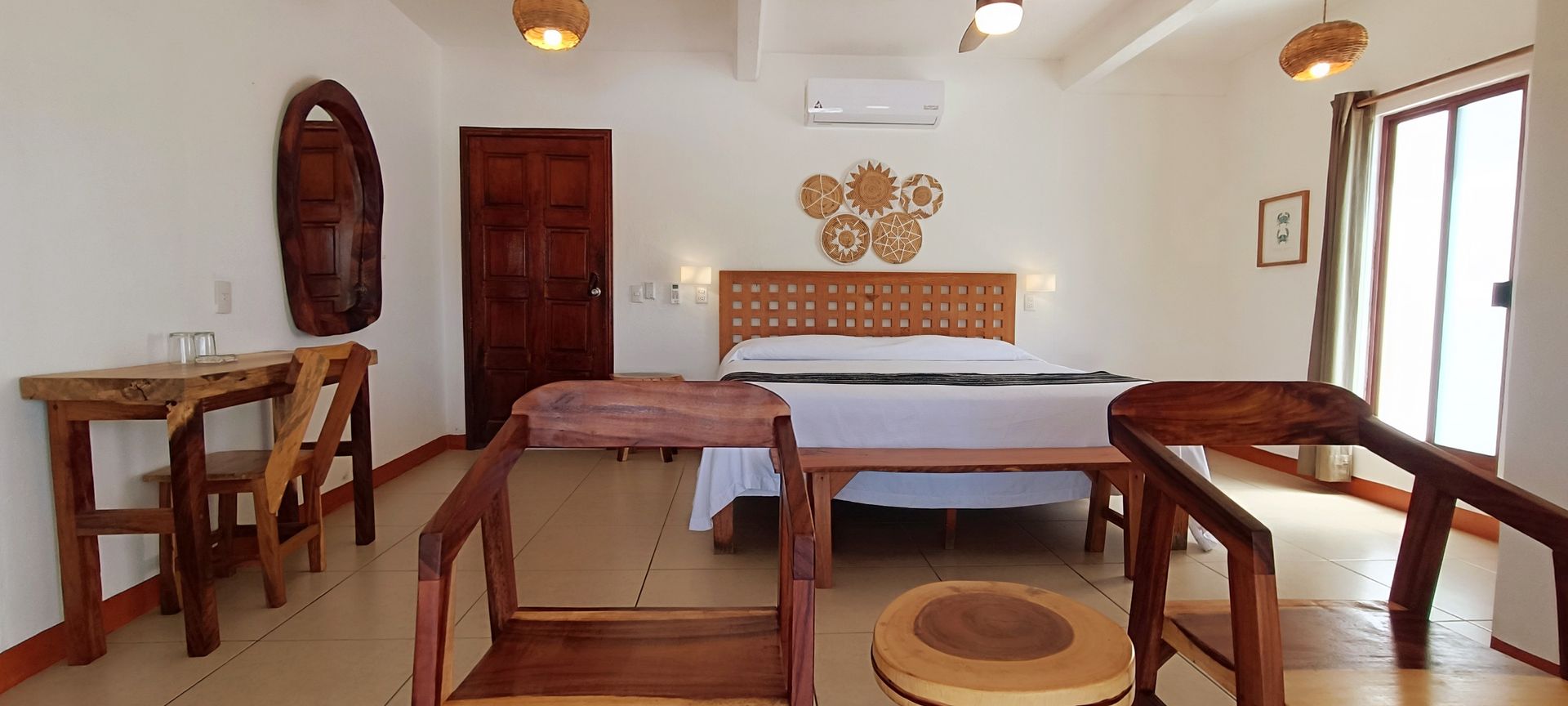 1 cama King size, Aire acondicionado, baño privado con agua caliente, ventiladores, caja de seguridad, wifi, limpieza diaria, toallas, balcón privado con 2 hamacas, vista directa al mar. NO cuenta con tv ni cocina. Se ubica en el segundo nivel.