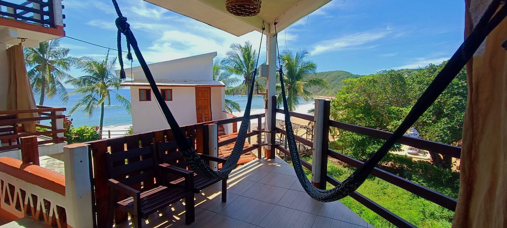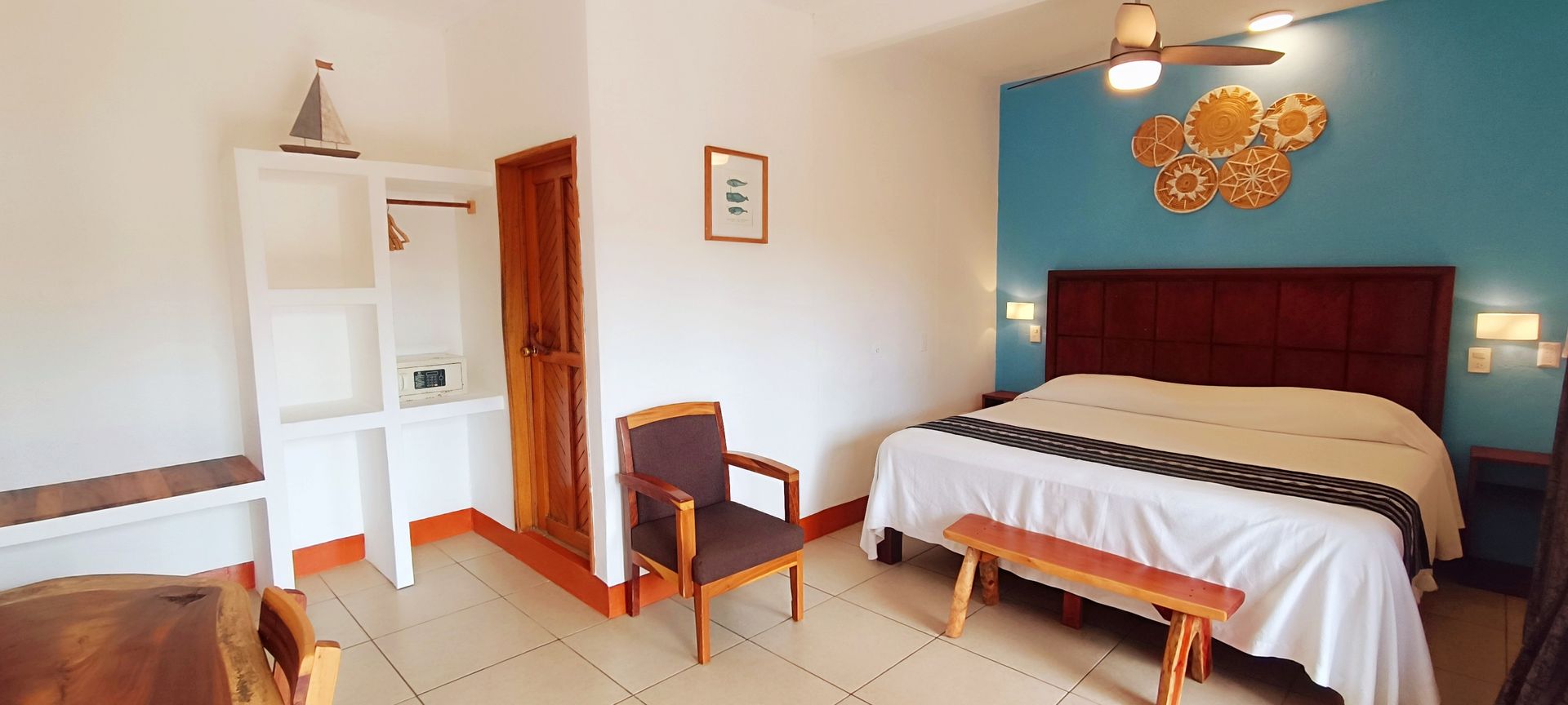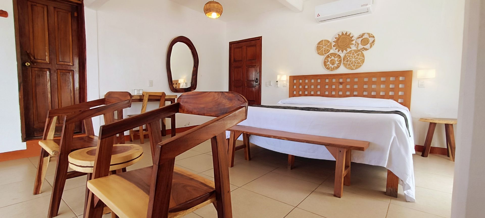 1 cama King size, Aire acondicionado, baño privado con agua caliente, ventiladores, caja de seguridad, wifi, limpieza diaria, toallas, balcón privado con 2 hamacas, vista directa al mar. NO cuenta con tv ni cocina. Se ubica en el segundo nivel.