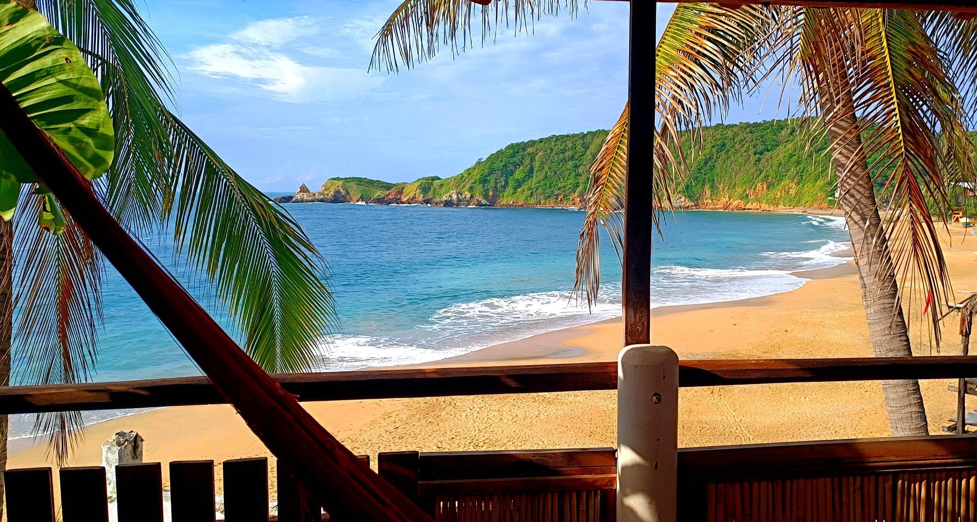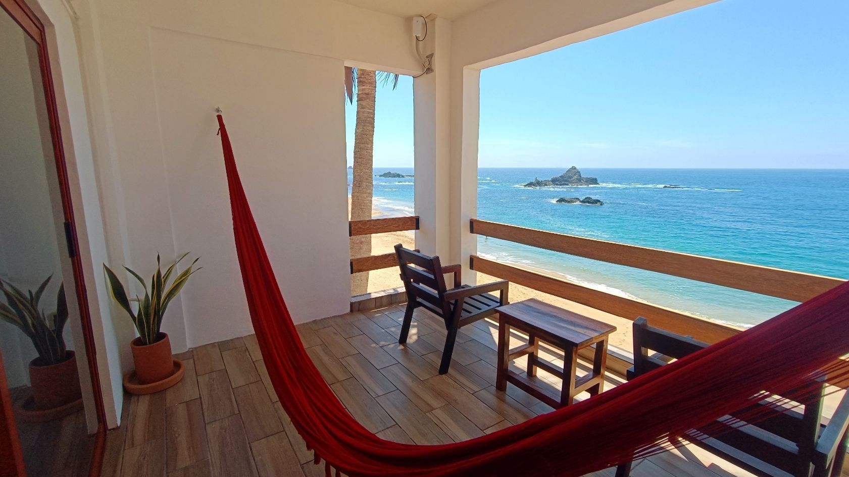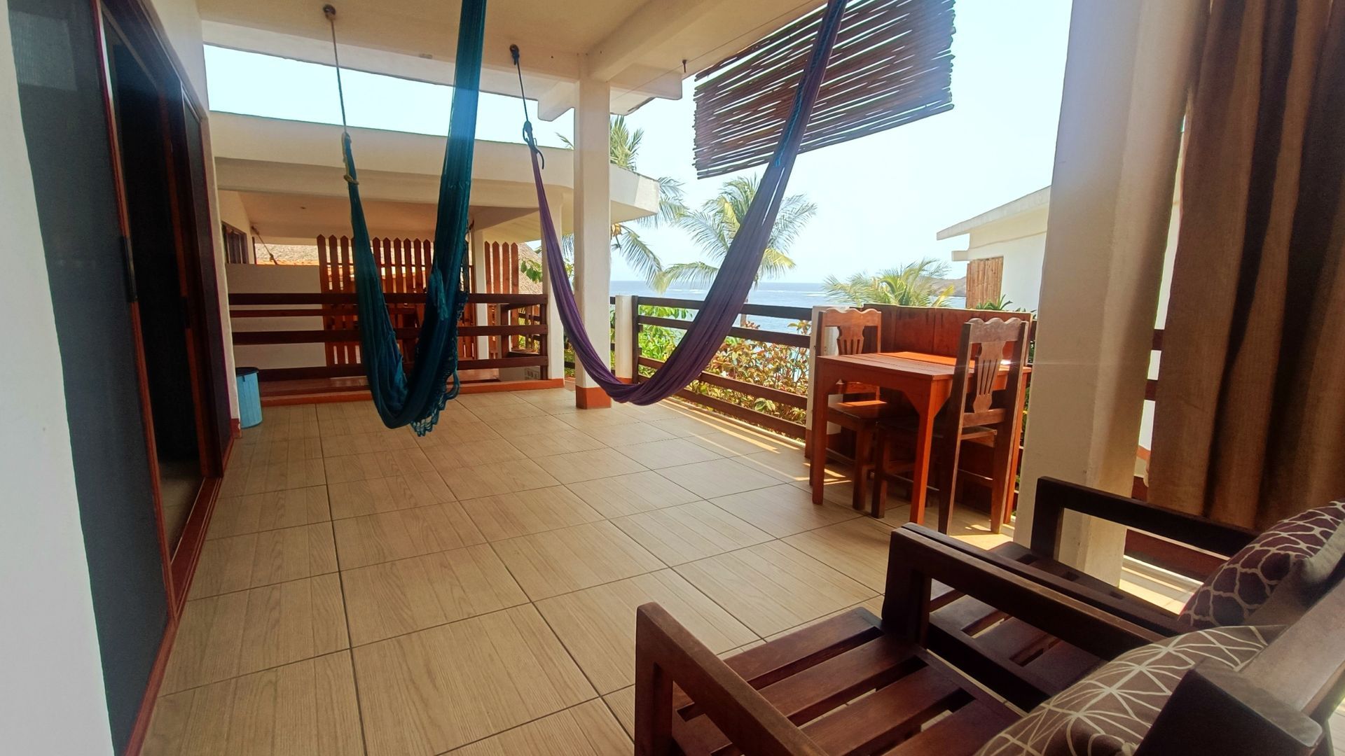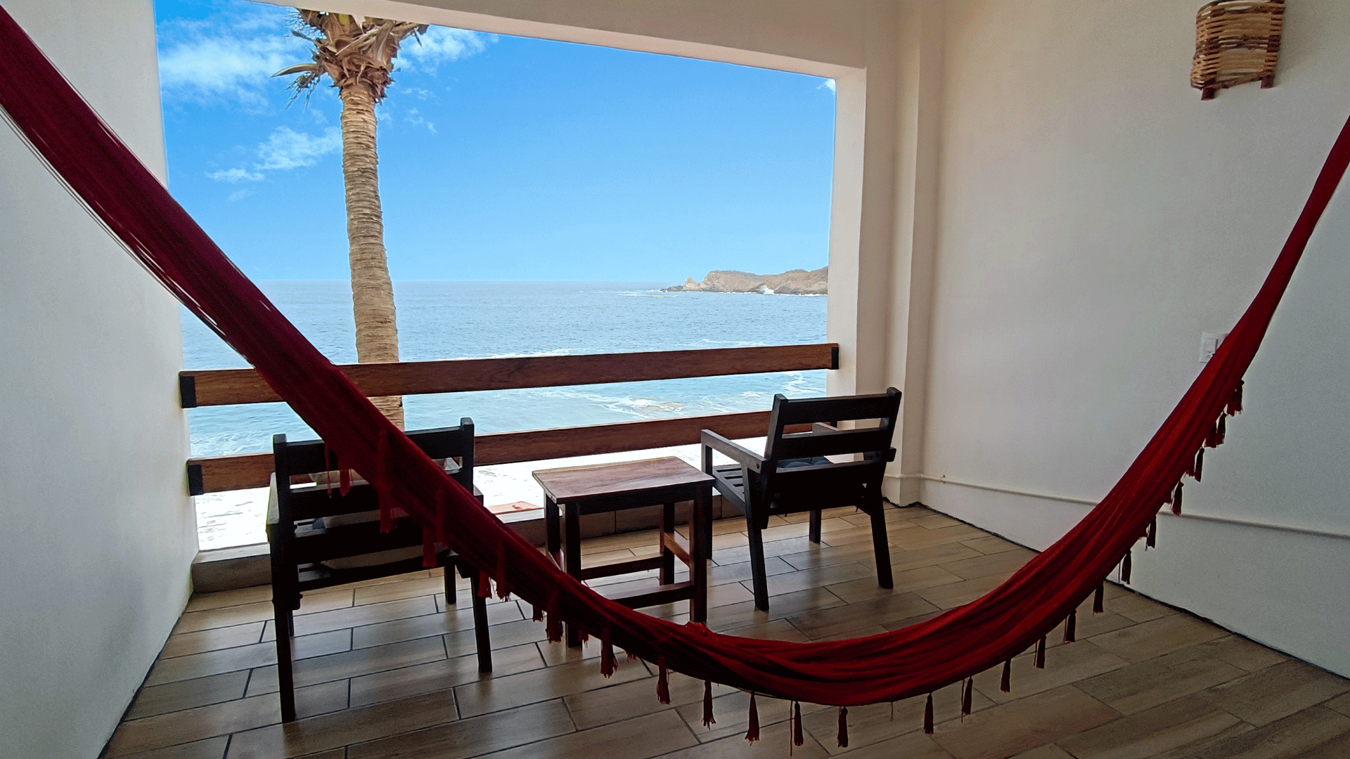 1 cama King size, Aire acondicionado, baño privado con agua caliente, ventiladores, caja de seguridad, wifi, limpieza diaria, toallas, balcón privado con 2 hamacas, vista directa al mar. NO cuenta con tv ni cocina. Se ubica en el segundo nivel.