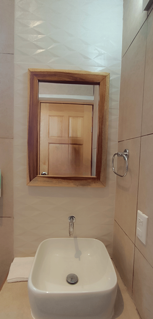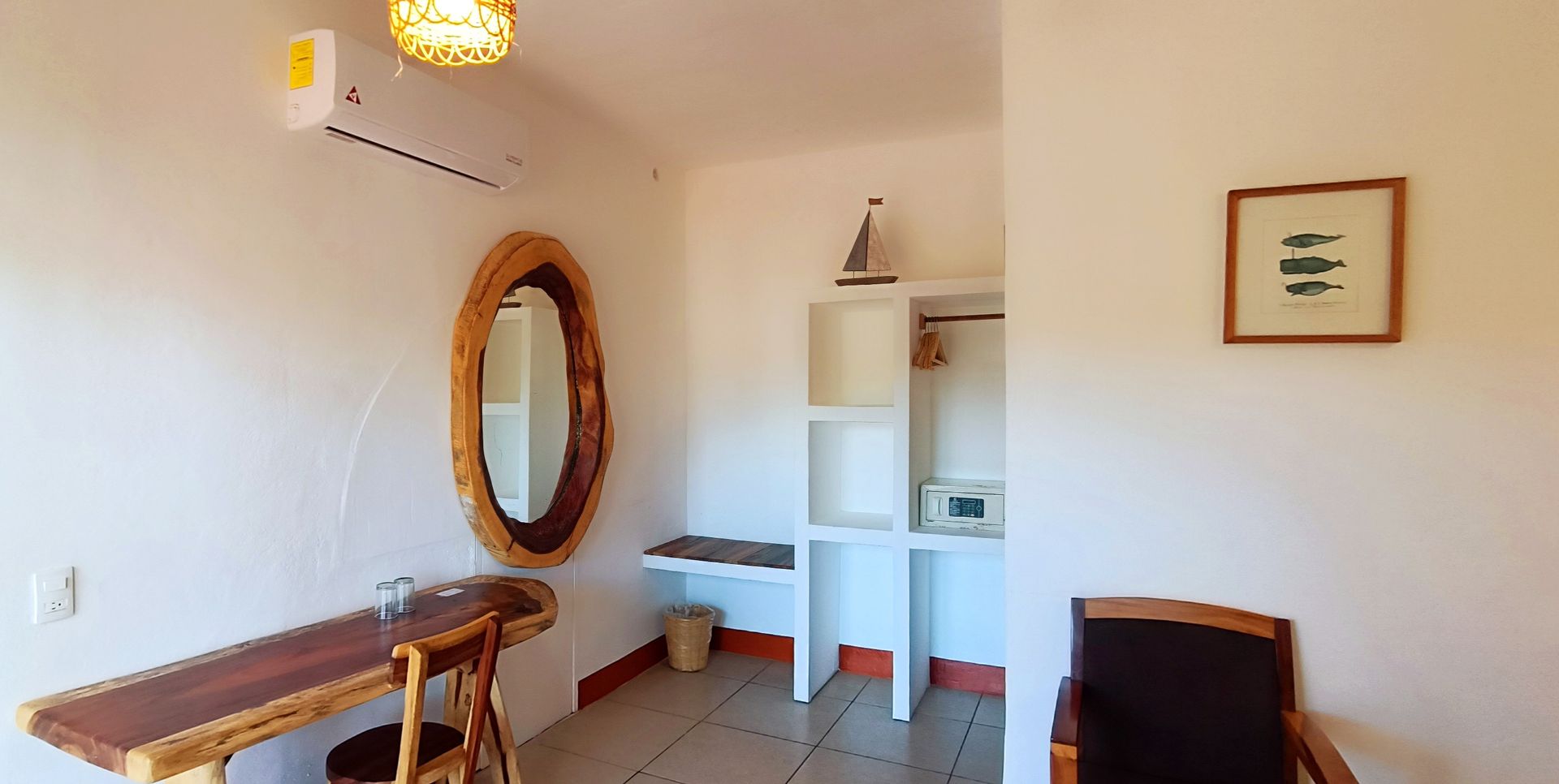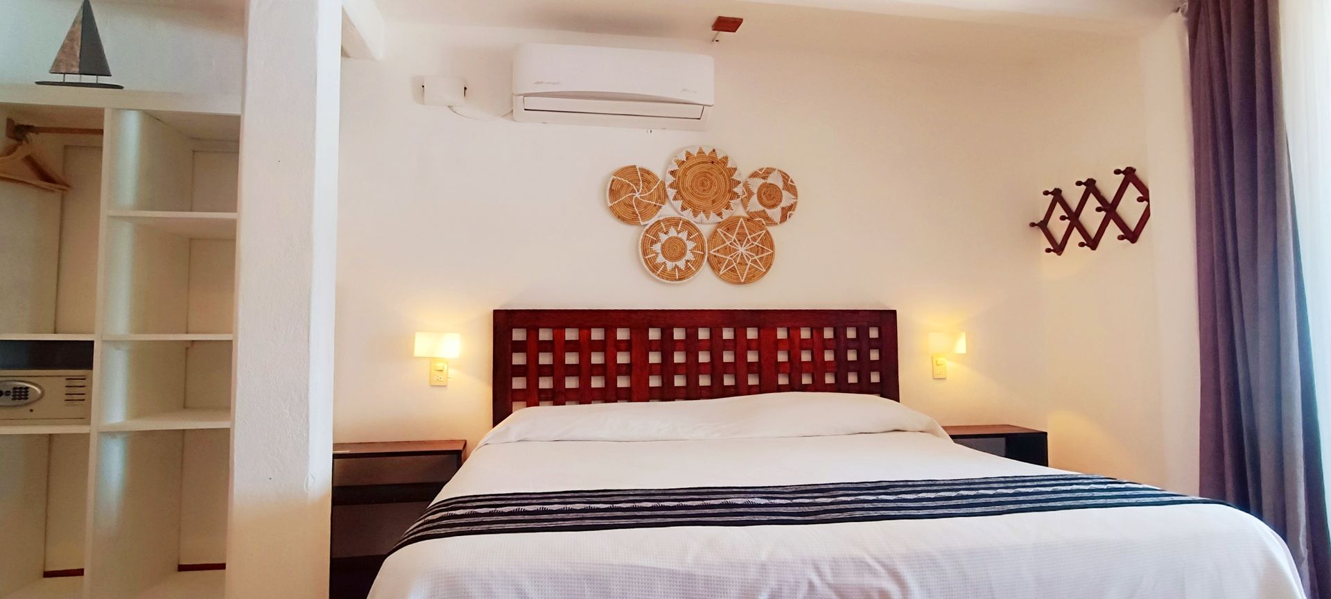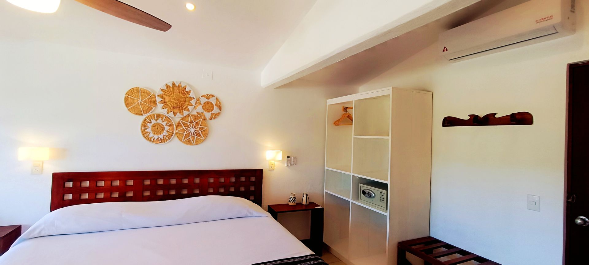 1 cama King size, Aire acondicionado, baño privado con agua caliente, ventiladores caja electrónica de seguridad, wifi, limpieza diaria, toallas, balcón con 1 hamaca sin vista al mar. NO cuenta con tv ni cocina. Se ubica en el segundo nivel.