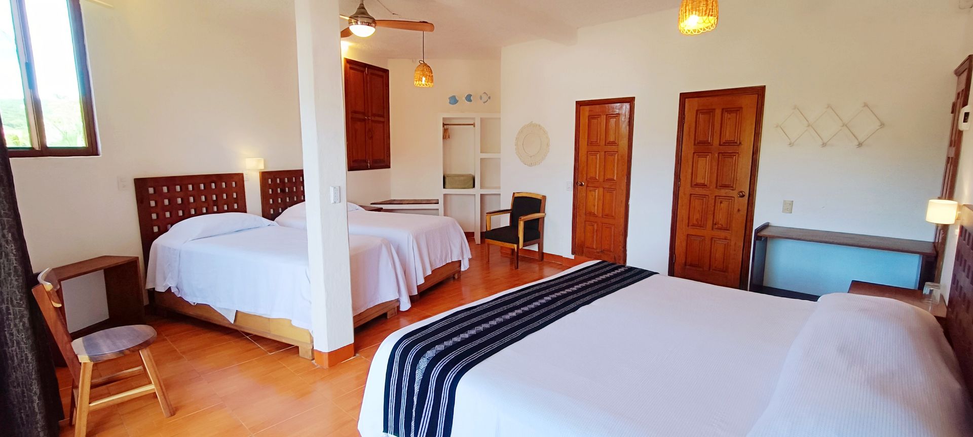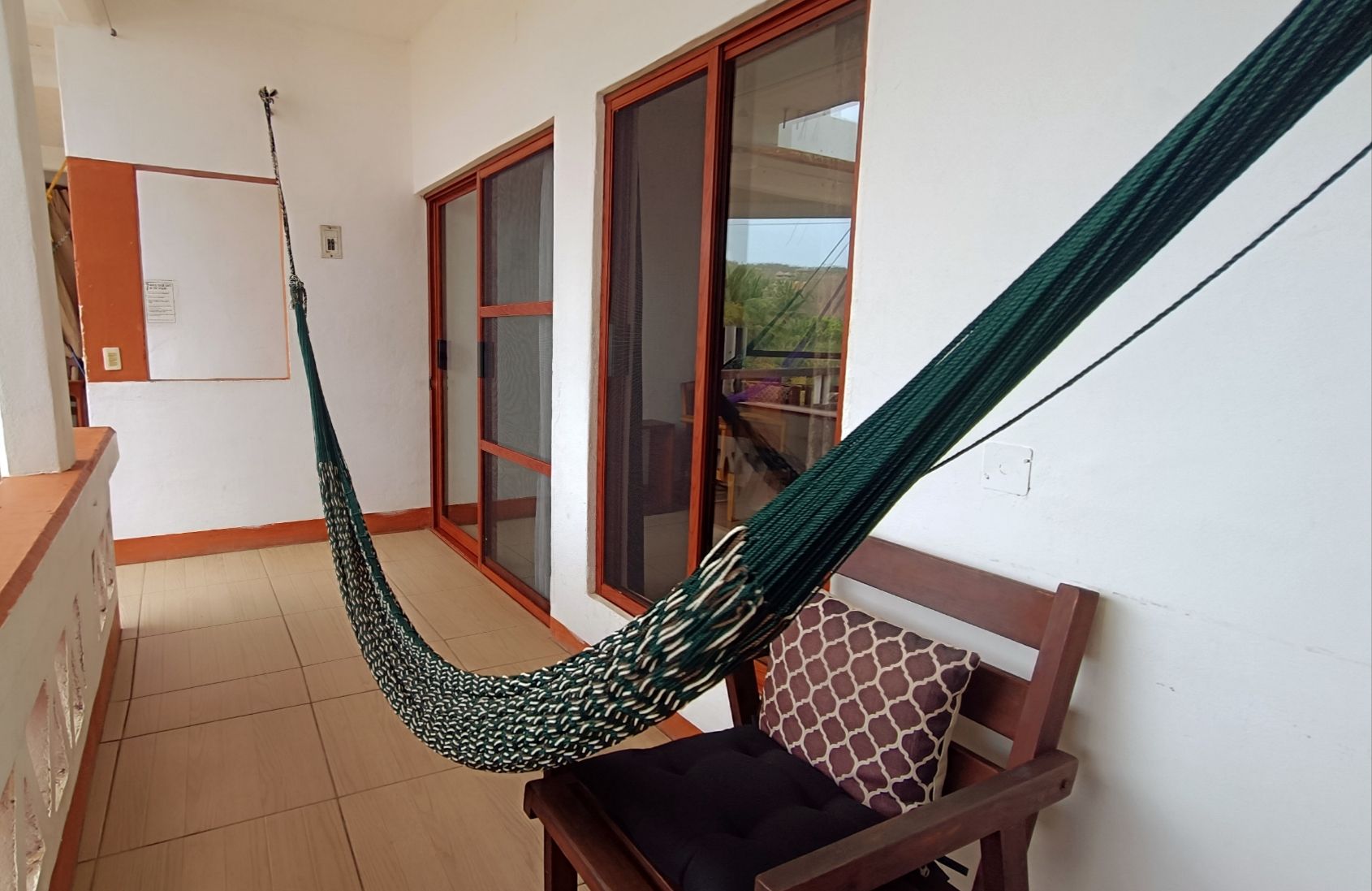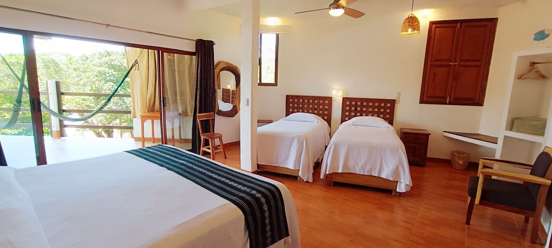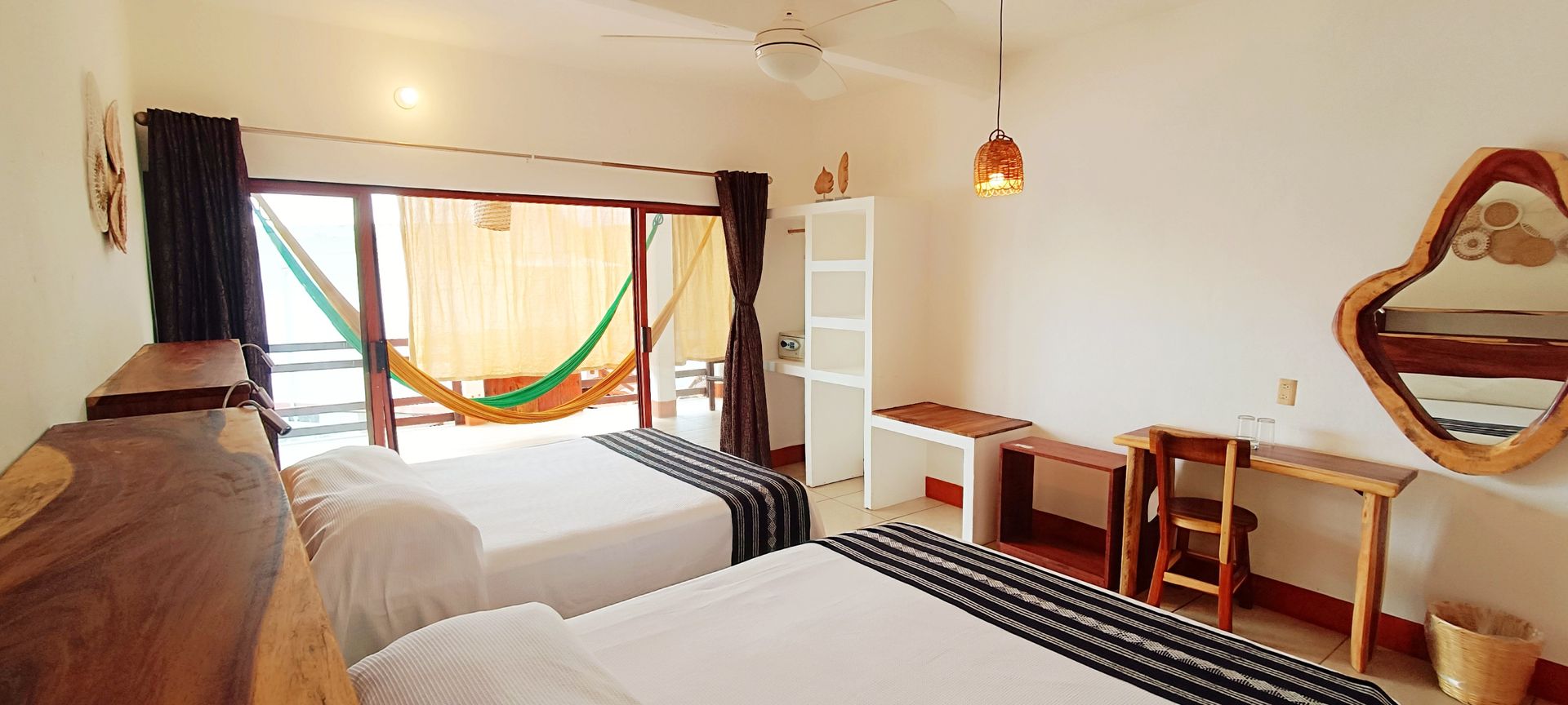 1 cama King size y 2 camas individuales, Aire acondicionado, baño privado con agua caliente, ventiladores wifi, limpieza diaria, toallas, balcón con 2 hamacas. NO cuenta ni tv ni cocina. Ubicada en segundo nivel.
