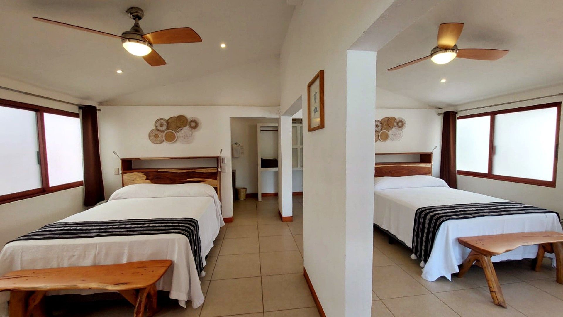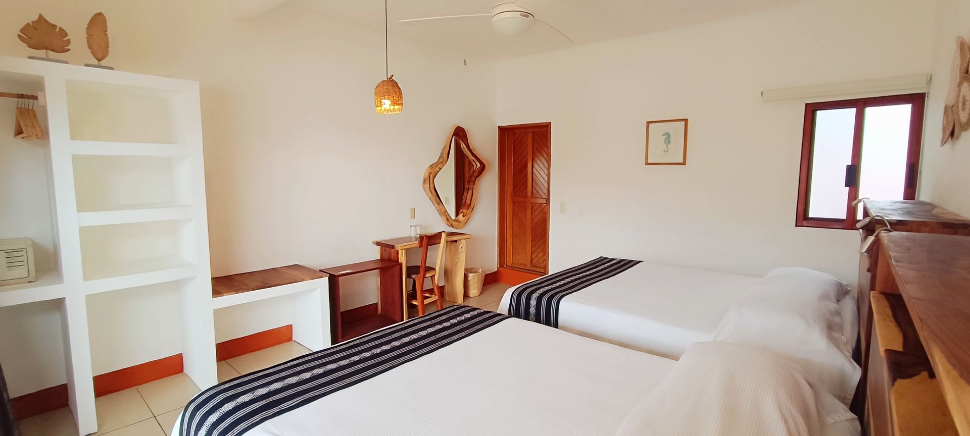 2 camas Queen size, Aire acondicionado, baño privado con agua caliente, ventiladores, caja de seguridad, wifi, limpieza diaria, toallas, terraza con vista al mar. NO cuenta con tv ni cocina. Se ubica en el segundo nivel.
