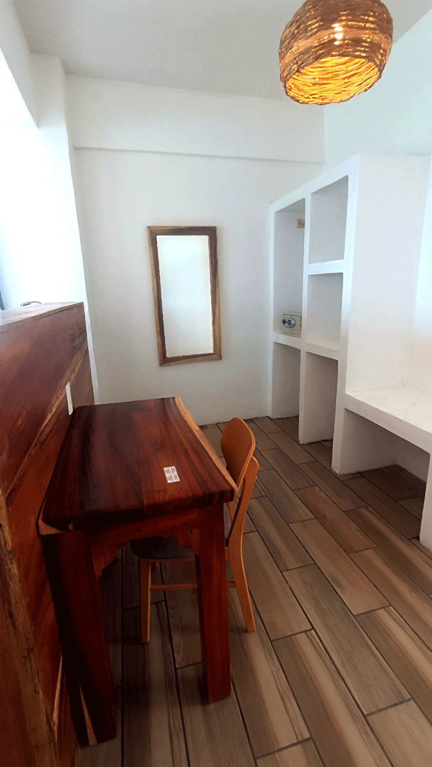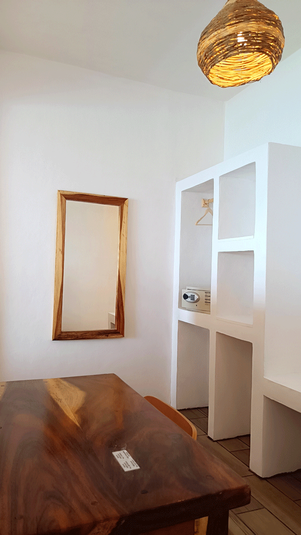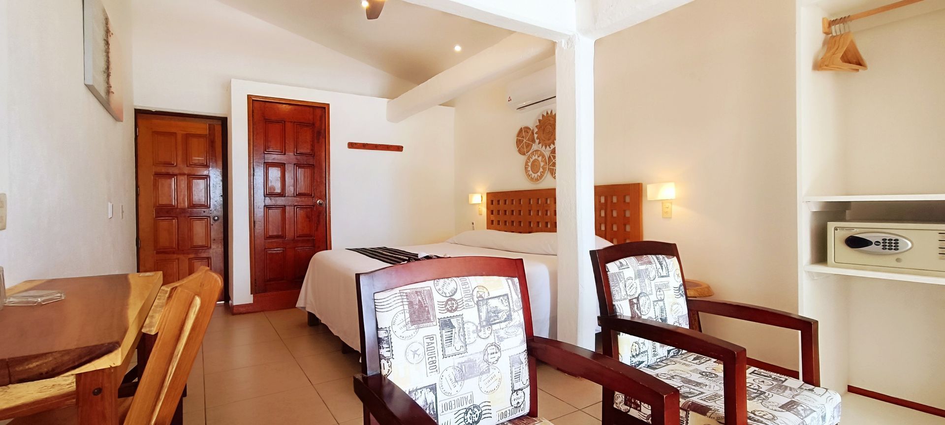 1 cama King size, baño privado con agua caliente, aire acondicionado, caja de seguridad, wifi, limpieza diaria, toallas, balcòn con vista directa al mar, NO cuenta ni tv, ni cocina. Se ubica en el segundo nivel.