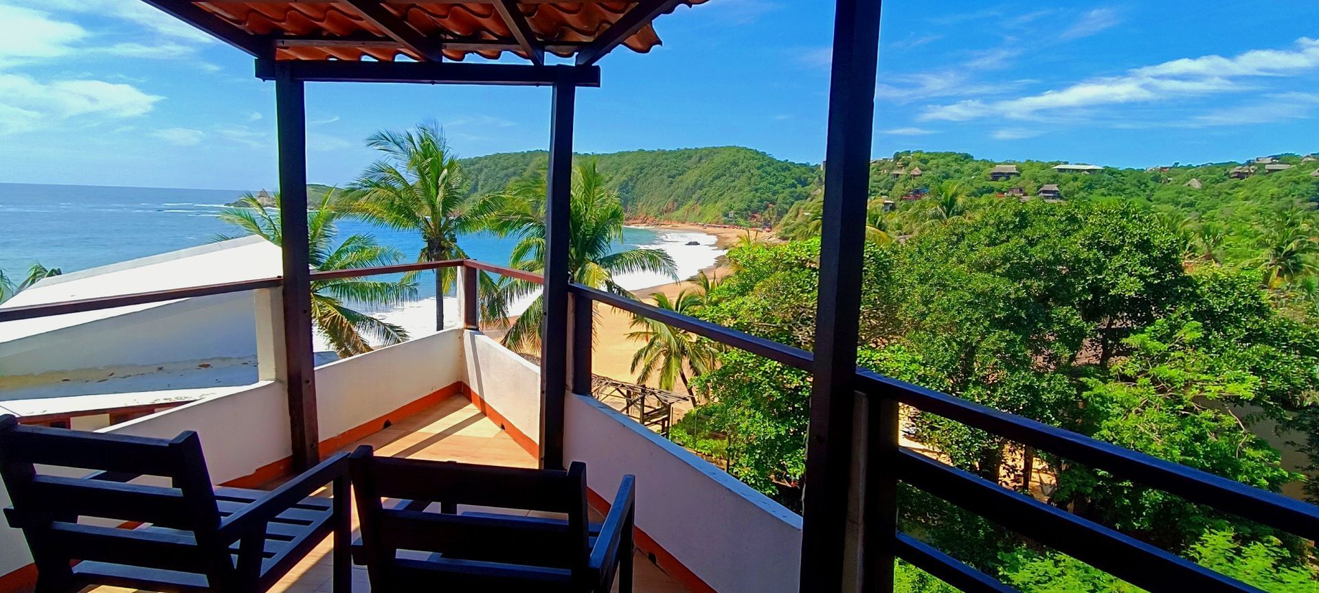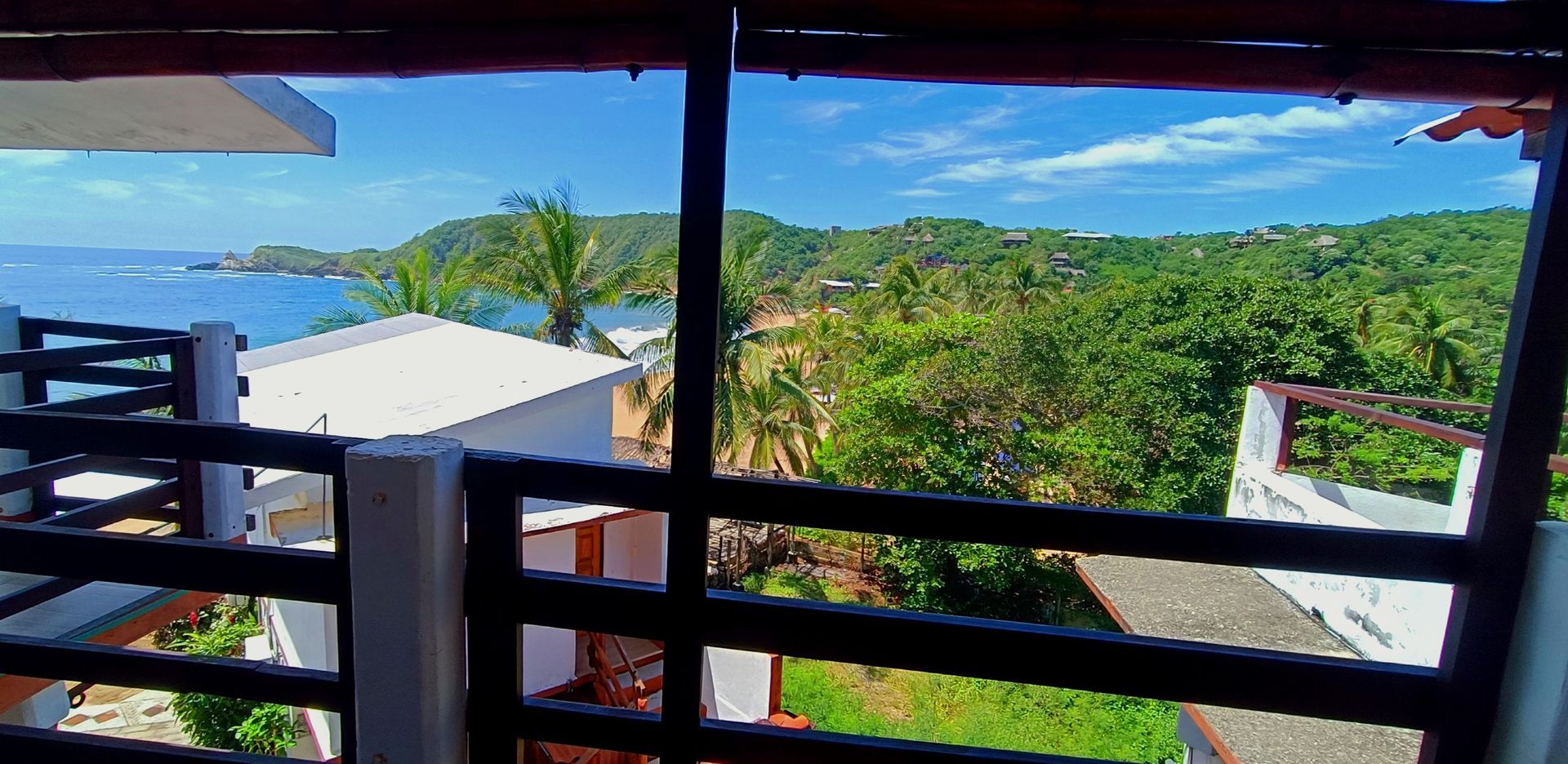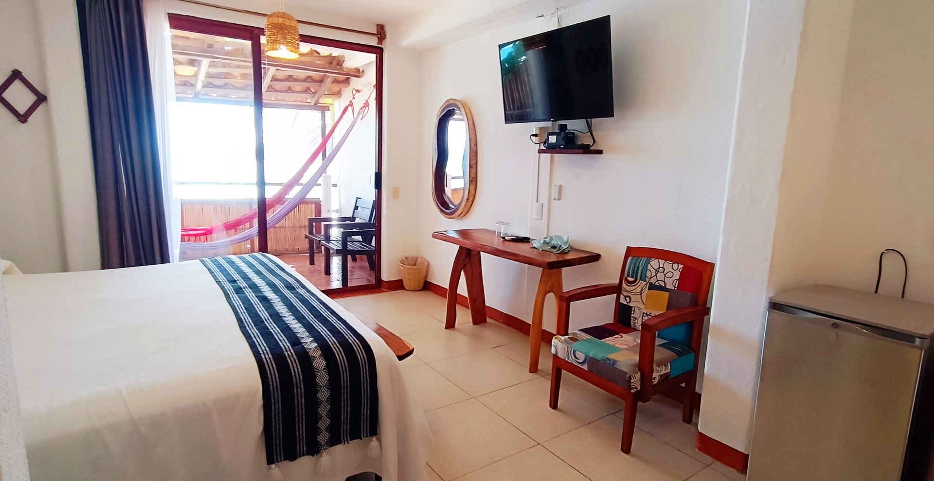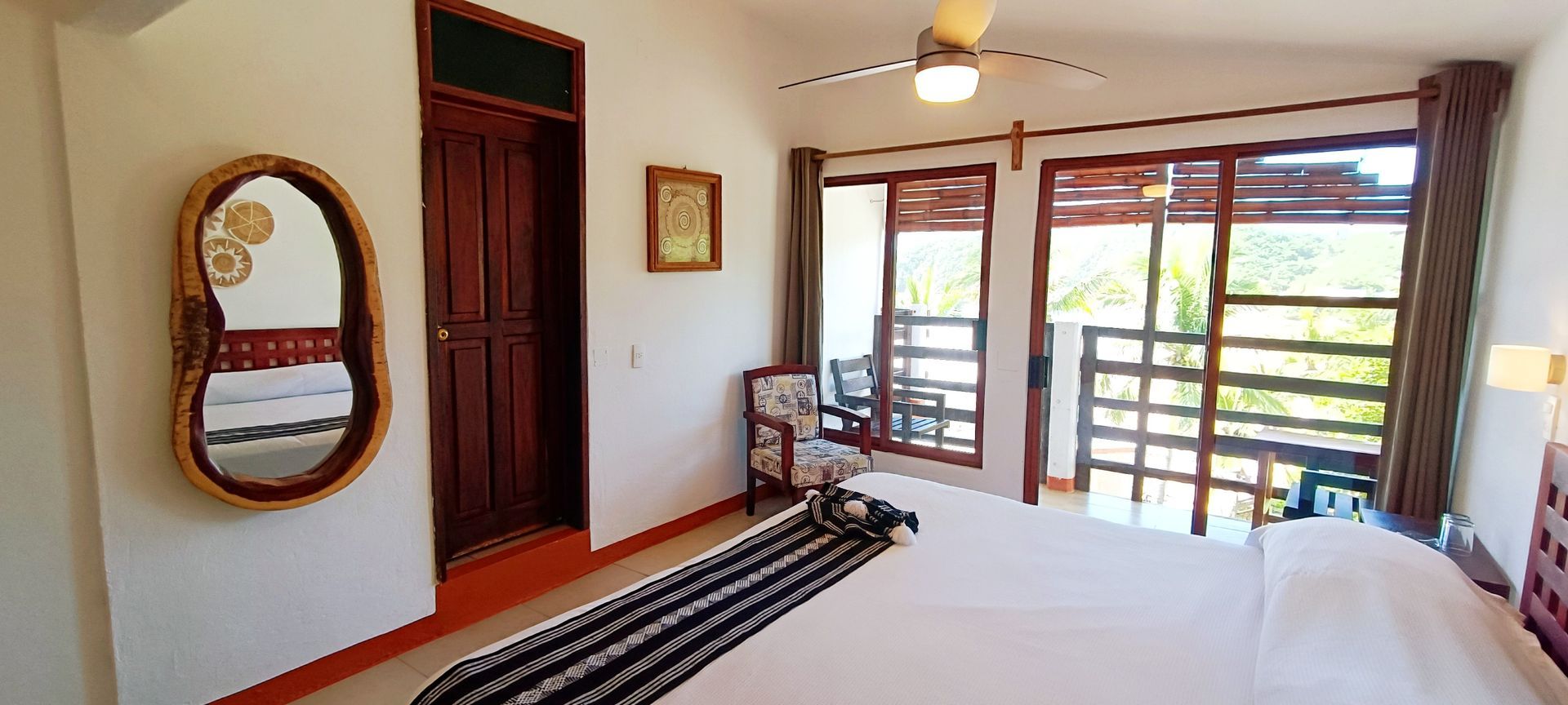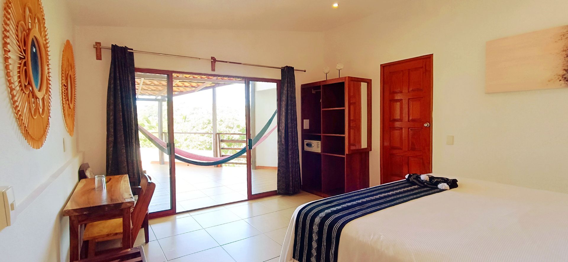 1 cama King size, baño privado con agua caliente, aire acondicionado, wifi, limpieza diaria, caja de seguridad, toallas, terraza privada con 2 hamacas , vista al mar y montaña, se ubica en el tercer nivel.