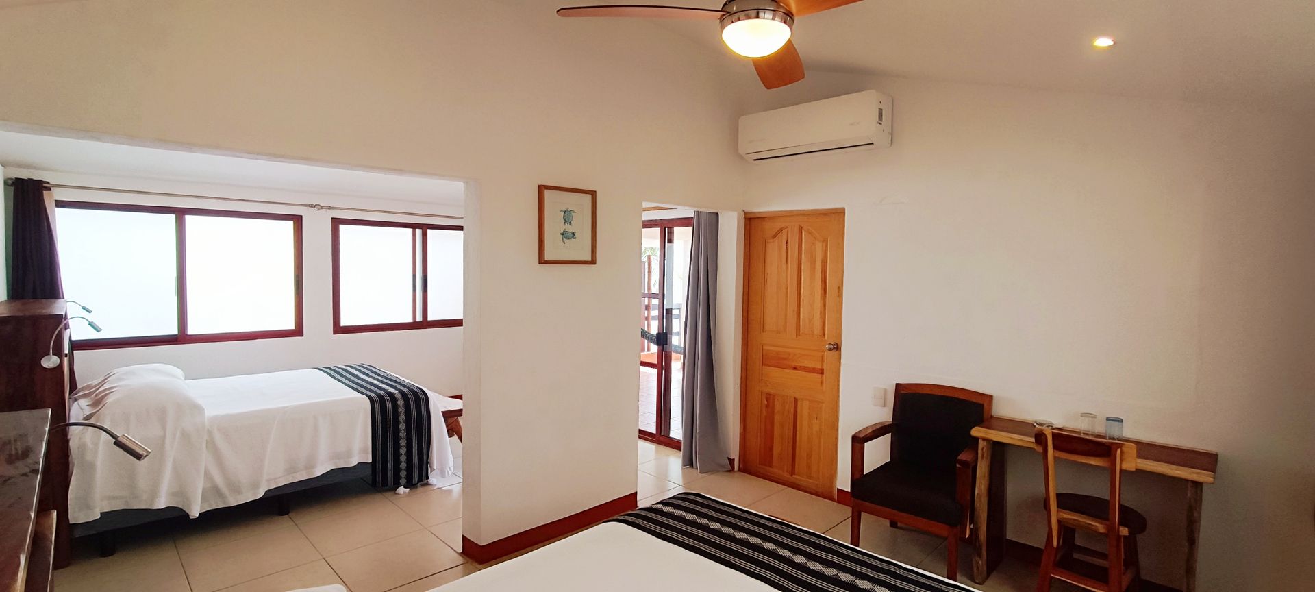 2 camas Queen size, Aire acondicionado, baño privado con agua caliente, ventiladores, caja de seguridad, wifi, limpieza diaria, toallas, terraza con 2 hamacas, vista parcial al mar. NO cuenta con tv ni cocina. Se ubica en el segundo nivel.