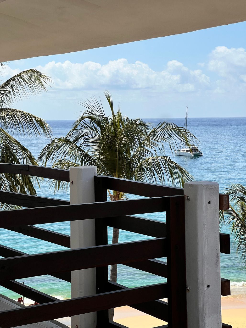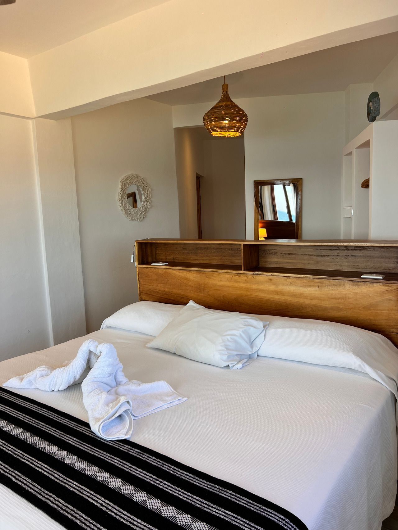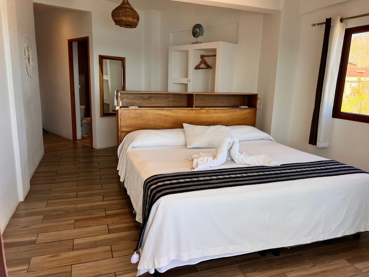 1 cama King size, baño privado con agua caliente, aire acondicionado, caja de seguridad, WiFi, limpieza diaria, toallas, balcón con vista directa al mar, no cuenta con TV ni cocina, se ubica en el segundo nivel.