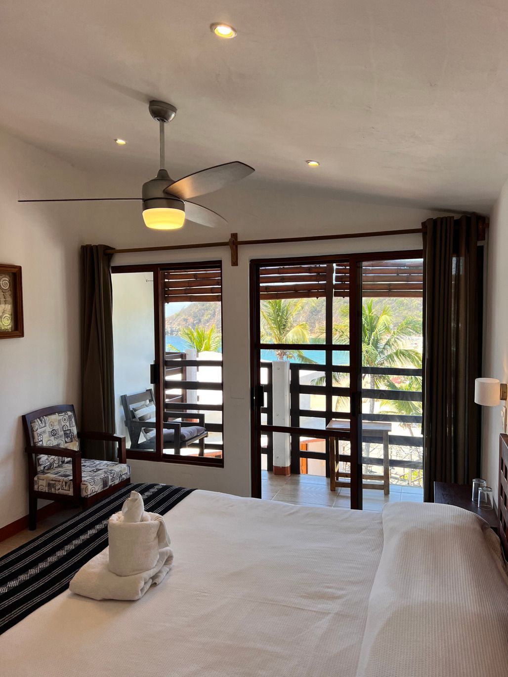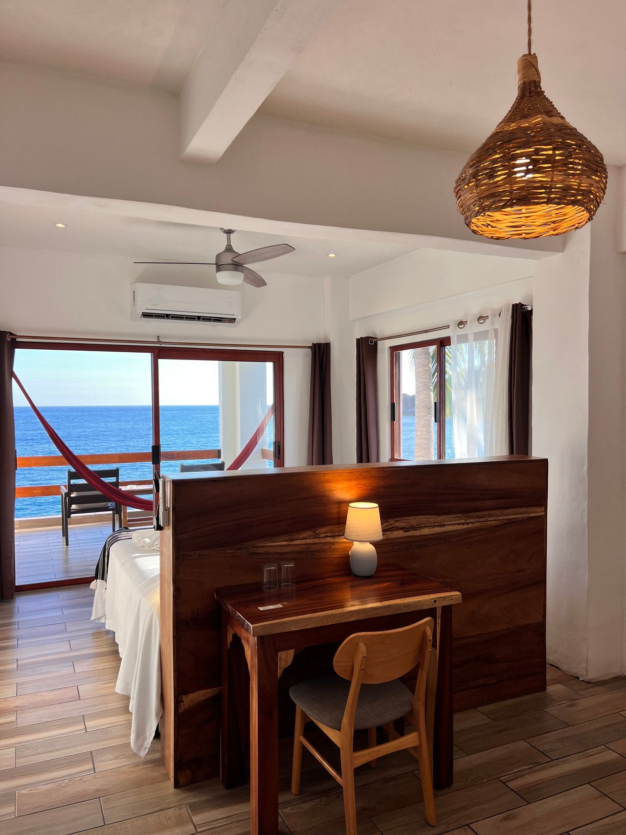 1 cama King size, baño privado con agua caliente, aire acondicionado, WiFi, limpieza diaria, caja de seguridad, toallas, terraza privada con 2 hamacas, vista al mar y montaña. Se ubica en el tercer nivel.