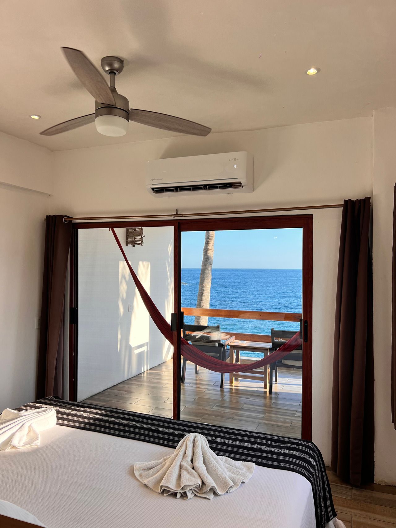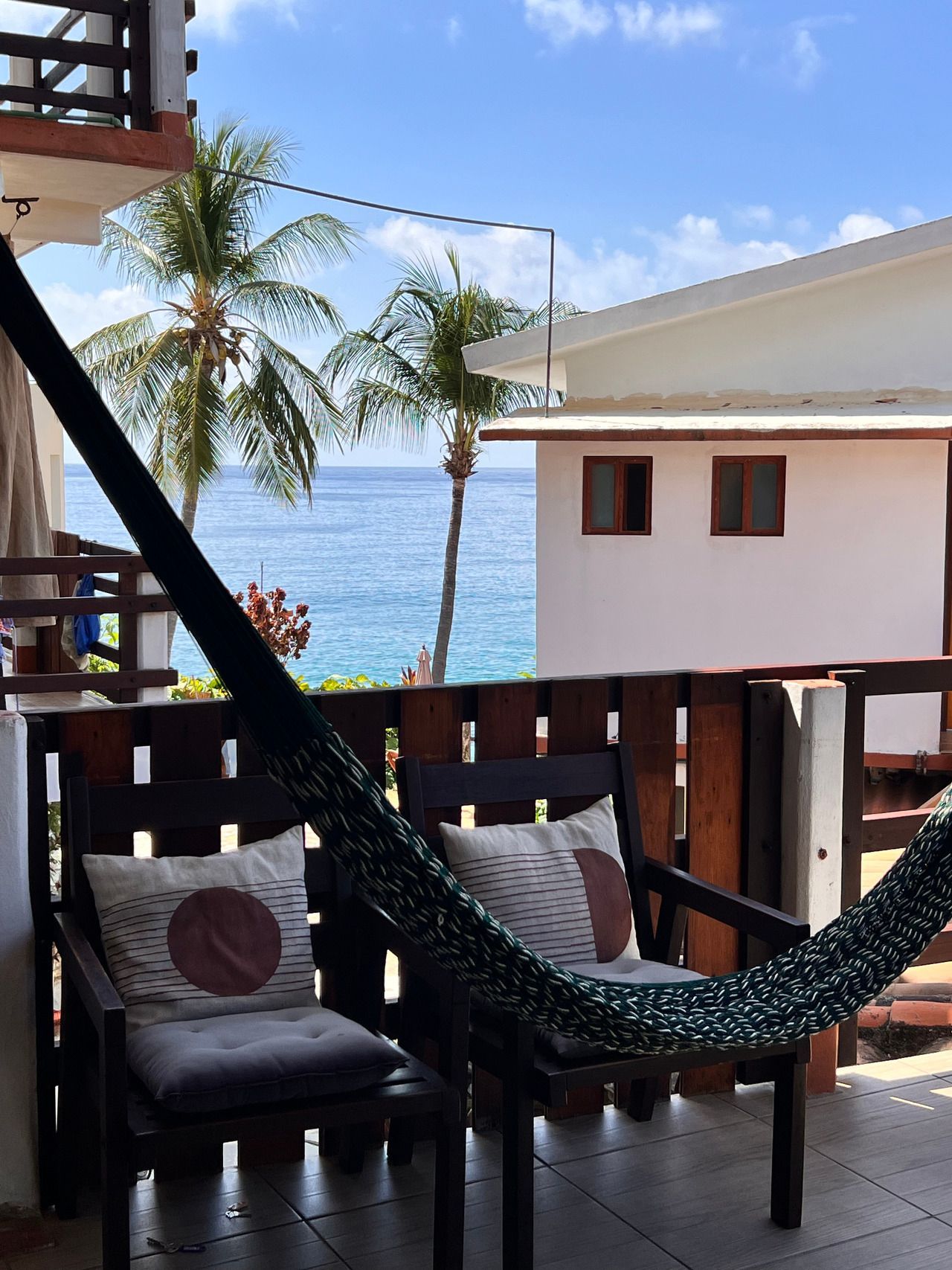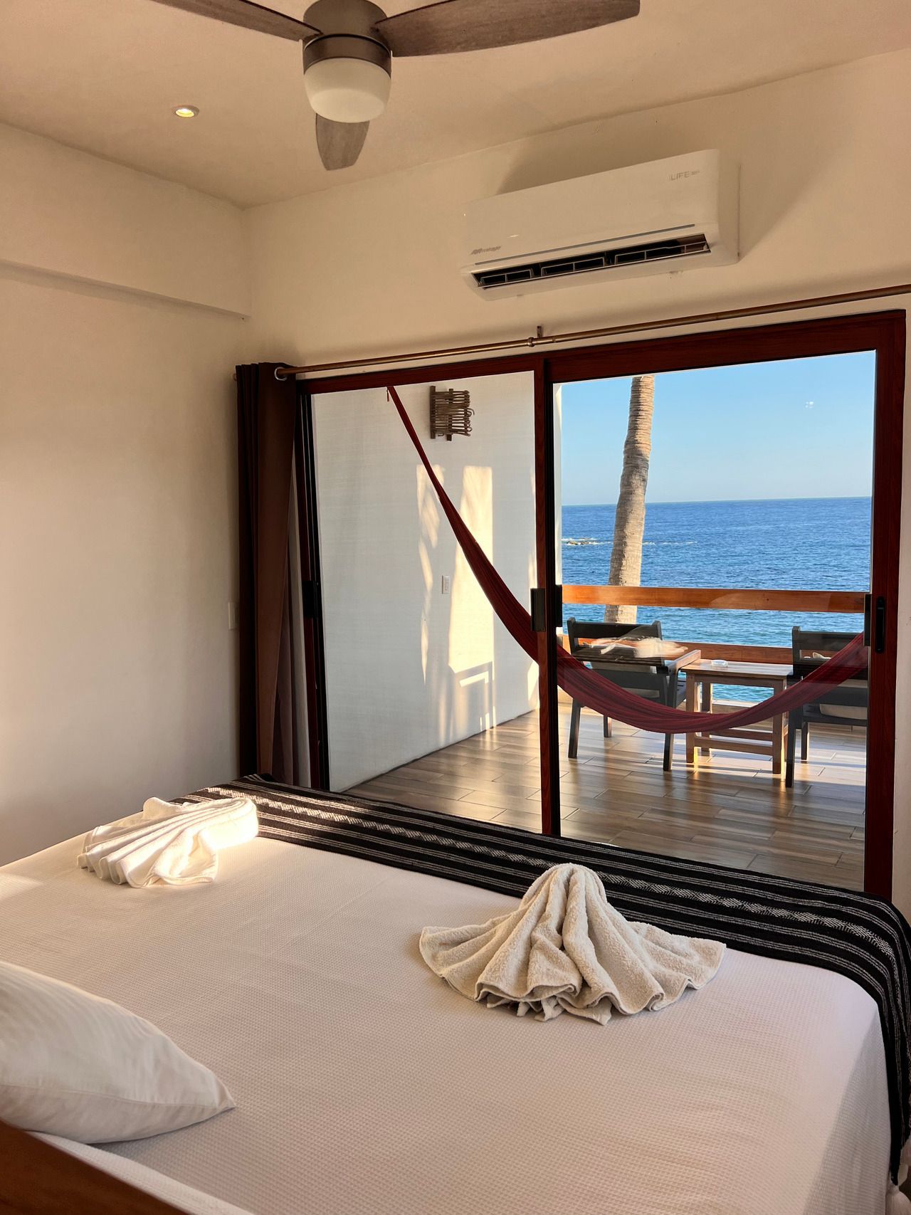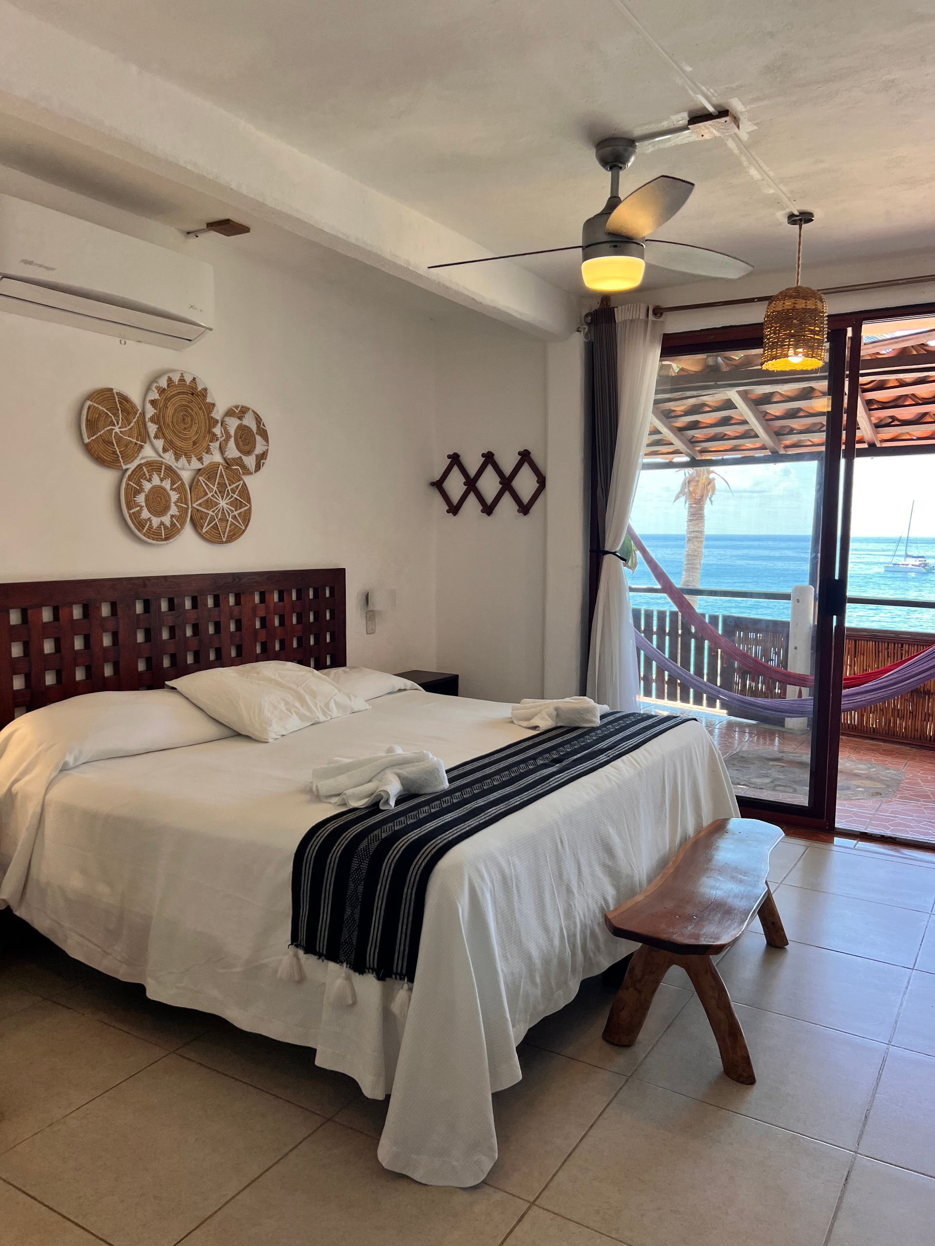 1 cama King size, aire acondicionado, baño privado con agua caliente, ventiladores, caja de seguridad, WiFi, limpieza diaria, toallas, terraza privada con 2 hamacas, vista al mar. No cuenta con TV ni cocina. Se ubica en el tercer nivel.
