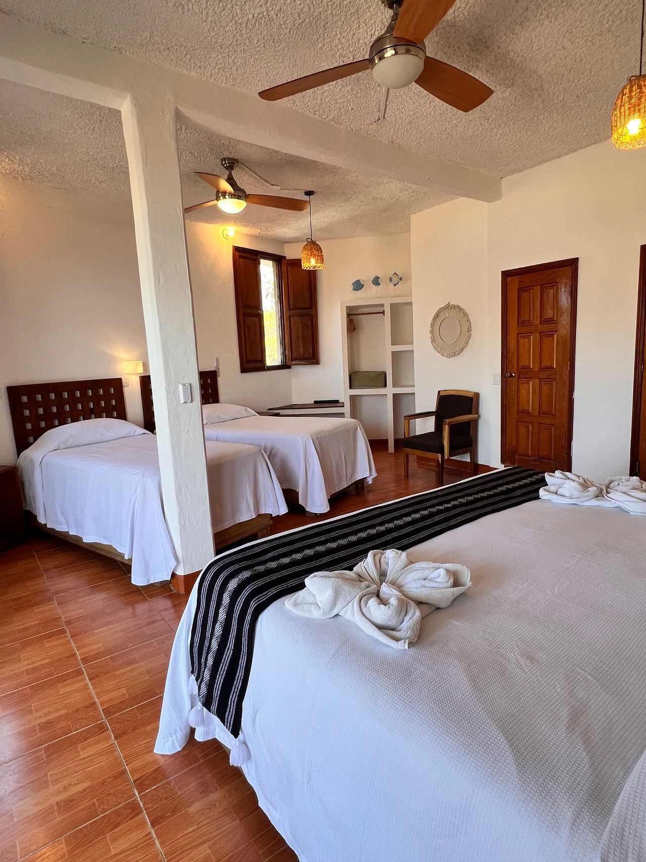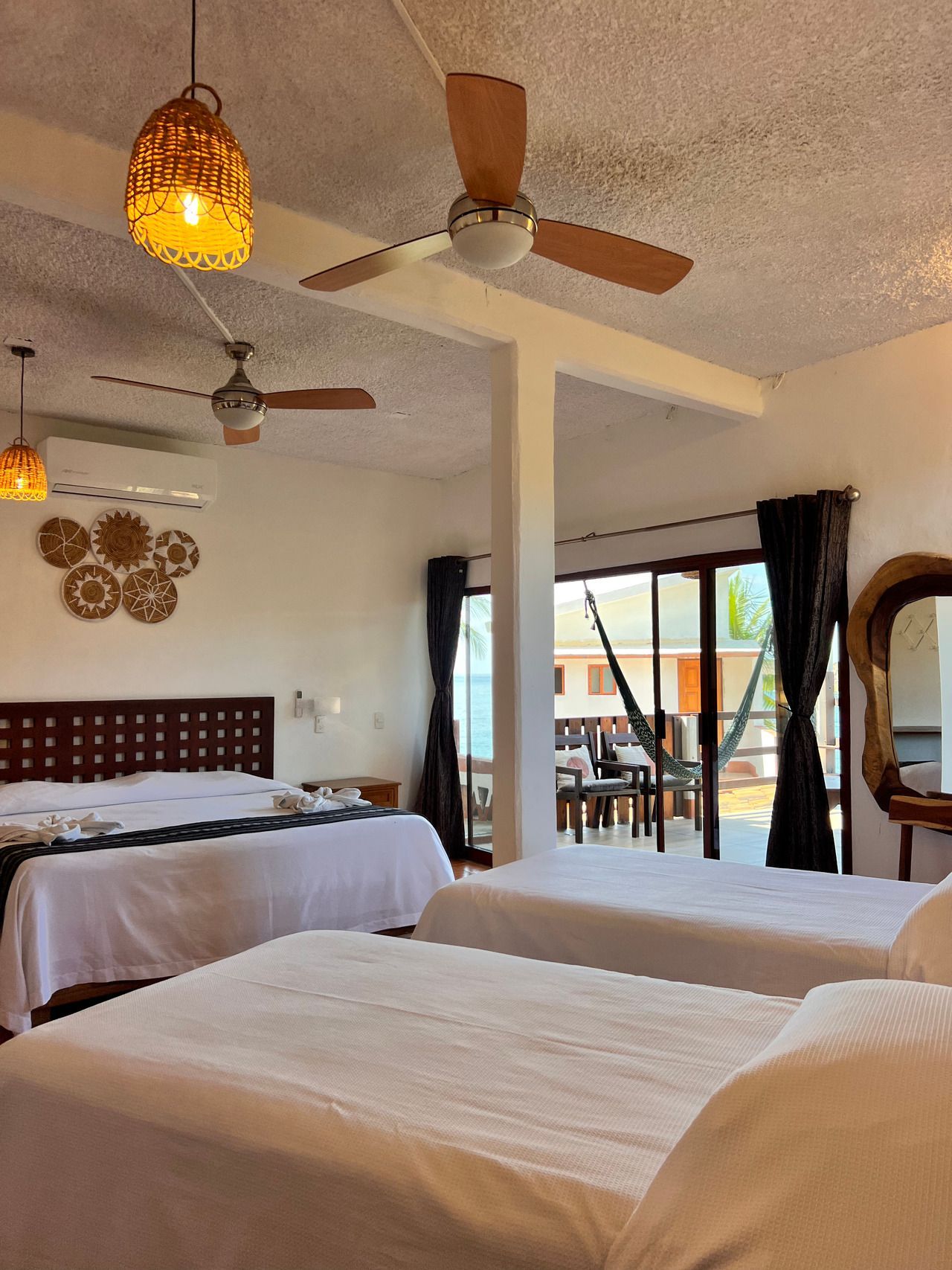 1 cama King size y 2 camas individuales, aire acondicionado, baño privado con agua caliente, ventiladores, WiFi, limpieza diaria, toallas, balcón con 2 hamacas, no cuenta con TV ni cocina, ubicada en segundo nivel.